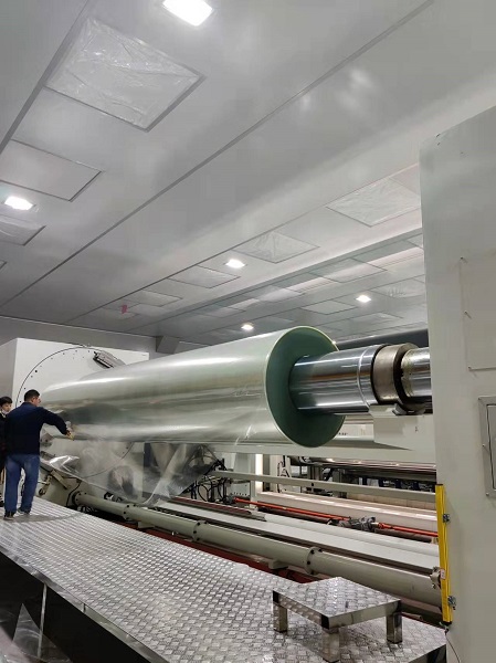 在項(xiàng)目組全體同事的共同努力下,本項(xiàng)目從設(shè)備進(jìn)場(chǎng)到安裝調(diào)試歷時(shí)僅四個(gè)半月,一次開(kāi)機(jī)即投料成功,4小時(shí)即從模頭流延出厚片上收卷,2小時(shí)內(nèi)換卷即收成3000米大卷,創(chuàng)造了北自所同類拉膜生產(chǎn)線中安裝最快、調(diào)試最快、成膜速度最快的優(yōu)異成績(jī)。