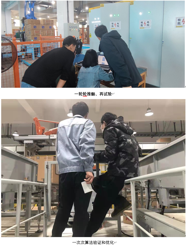 針對這一創(chuàng)新理念,在物流碼垛行業(yè)幾乎是空白,團隊成員可借鑒的成功經(jīng)驗不多,所有的工作都要從零開始。萬事開頭難,項目組成立以后,迅速分工協(xié)作、開展工作。團隊成員根據(jù)已有經(jīng)驗和問題導(dǎo)向,咨詢業(yè)內(nèi)專家分析可行性,提出多種大膽想法,一遍遍地設(shè)計驗證,一次次地推倒重來。從創(chuàng)意的雛形初定到最終柔性碼垛方案的完成,中間經(jīng)歷了無數(shù)波折與困難。那段時間,團隊成員晚上加班編程,白天現(xiàn)場驗證,頂住了巨大的壓力,一路奮斗協(xié)作,“創(chuàng)新之火”在團隊成員心中熊熊燃燒!