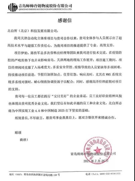 項(xiàng)目執(zhí)行過程中,正值新冠疫情在我國冷鏈行業(yè)肆虐之時(shí),北自科技團(tuán)隊(duì)展示了良好的精神風(fēng)貌和職業(yè)素養(yǎng),克服了重重困難,以認(rèn)真的態(tài)度、專業(yè)的管理和過硬的技術(shù)感動(dòng)了客戶,客戶特地發(fā)來感謝信,以表彰北自科技團(tuán)隊(duì)在項(xiàng)目中的突出表現(xiàn)。