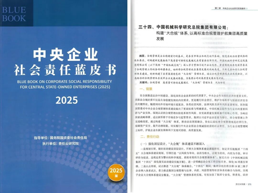 會上,《中央企業(yè)社會責任藍皮書(2025)》正式發(fā)布,集團“構(gòu)建大合規(guī)體系,以高標準合規(guī)管理護航集團高質(zhì)量發(fā)展”案例成功入選。