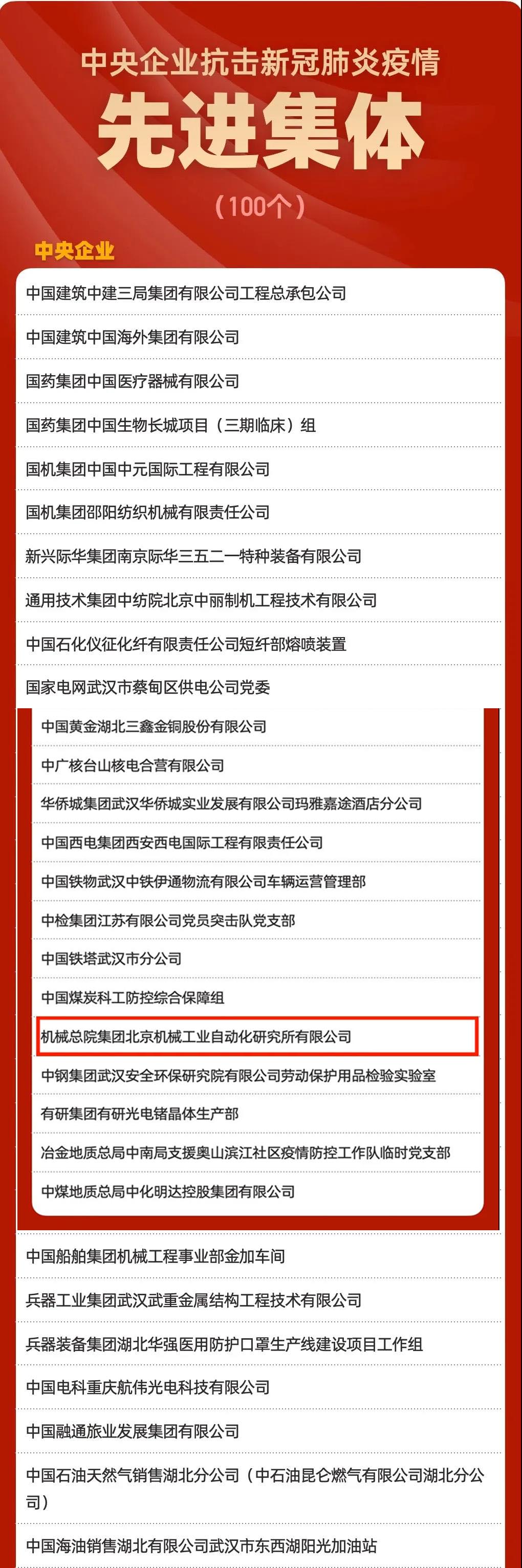 北京機(jī)械工業(yè)自動(dòng)化研究所有限公司(以下簡稱北自所)因在抗擊新冠肺炎疫情中的突出表現(xiàn)榮獲“中央企業(yè)抗擊新冠肺炎疫情先進(jìn)集體”稱號(hào)。