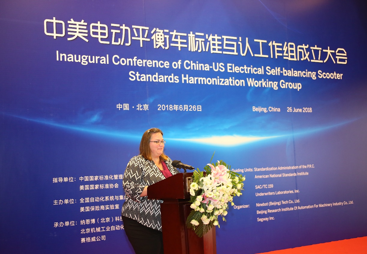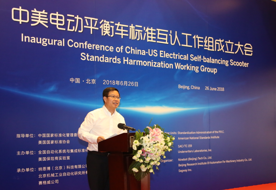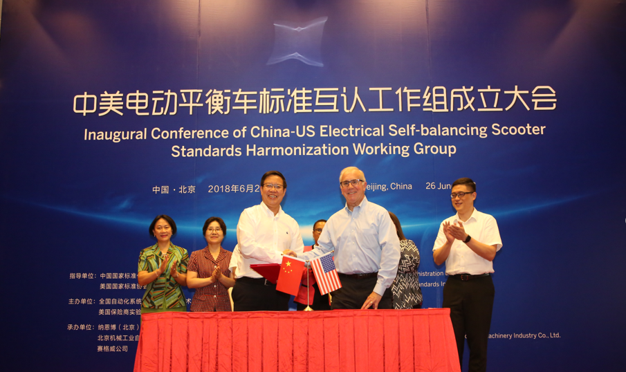6月26日,中美電動平衡車標準互認工作組成立大會在北京唯實大廈成功舉行。全國自動化系統(tǒng)與集成標準化技術(shù)委員會主任委員、機械總院集團董事長王德成與美國保險商實驗室全球副總裁 Philip M.Piqueira分別代表中美雙方簽署電動平衡車標準互認合作協(xié)議。中國國家標準化管理委員會副主任殷明漢、IEC美國國家委員會副主席Sonya Bird、美國大使館參贊Cynthia Griffin、北京航空航天大學(xué)教授王田苗、全國自動化系統(tǒng)與集成標準化技術(shù)委員會秘書長黎曉東、Segway-Ninebot公司總裁王野等領(lǐng)導(dǎo)及電動平衡車國家標準起草組專家出席會議,共同見證了中美兩國標準化合作的歷史時刻。
