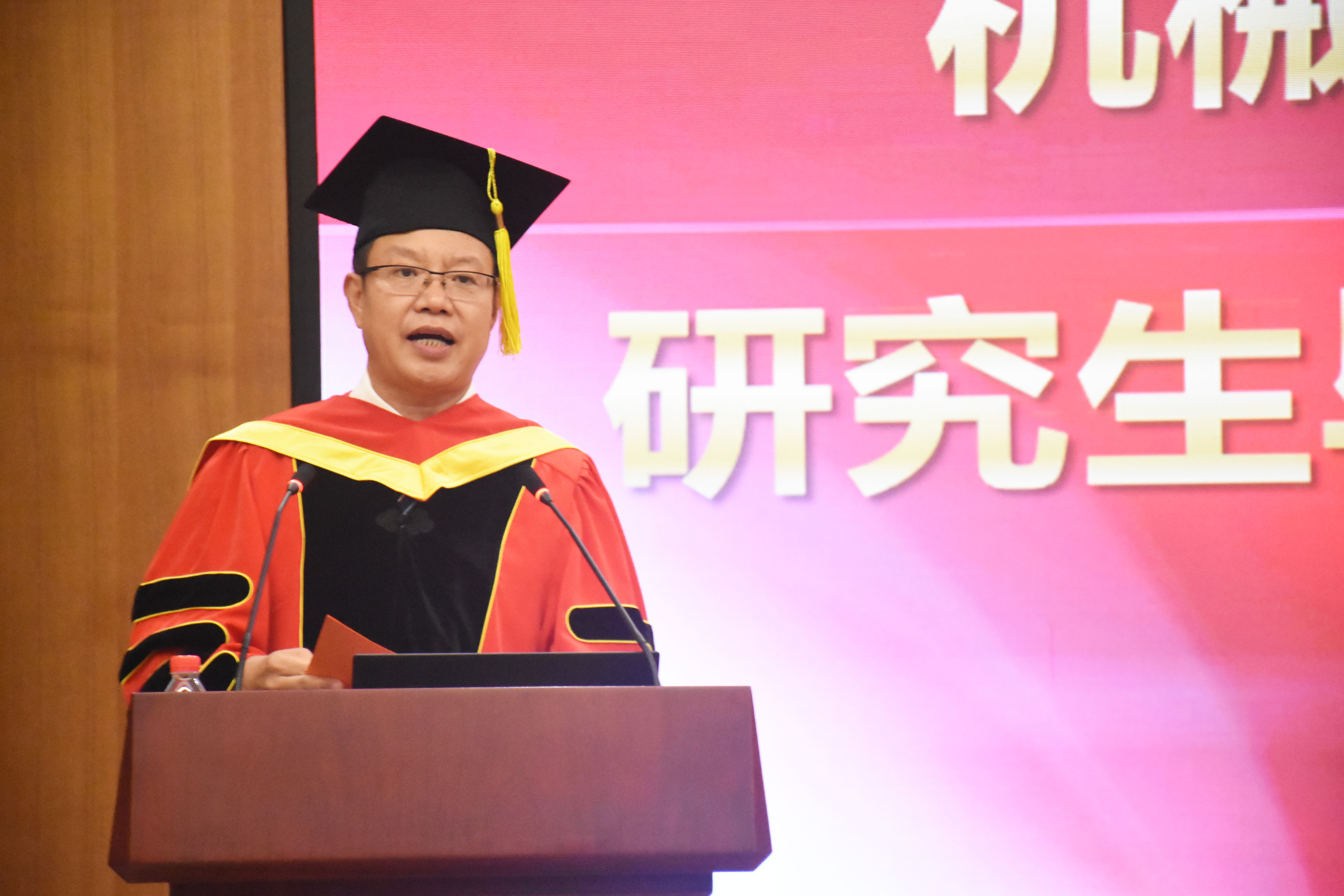 最后,王德成主席作了重要講話,他祝賀所有畢業(yè)生順利畢業(yè)并取得學(xué)位,對(duì)導(dǎo)師、各研究生培養(yǎng)單位以及相關(guān)職能部門的辛勤工作表示感謝,對(duì)家長們的默默付出致以敬意,并對(duì)畢業(yè)生們?cè)诮窈蟮膶W(xué)習(xí)工作中提出了三點(diǎn)希望:一是希望同學(xué)們牢固樹立正確的人生觀、價(jià)值觀,恪守做人之道,牢記習(xí)近平總書記“愛國、勵(lì)志、求真、力行”的囑托,進(jìn)一步培養(yǎng)自己的高尚情操,提升自己的人格品味;二是希望同學(xué)們不斷學(xué)習(xí)、持續(xù)提升和全面發(fā)展,永葆進(jìn)取之心,在新時(shí)代有新?lián)?dāng)和新作為,“幸福都是奮斗出來的,奮斗本身也是一種幸福”,“每個(gè)青年都應(yīng)該珍惜這個(gè)偉大時(shí)代,做新時(shí)代的奮斗者”;三是希望同學(xué)們志存高遠(yuǎn),“自信人生二百年,會(huì)當(dāng)水擊三千里”,不斷發(fā)揚(yáng)創(chuàng)新精神和“工匠精神”,腳踏實(shí)地,愛黨愛國、愛院愛家,奏響更加精彩的人生篇章。