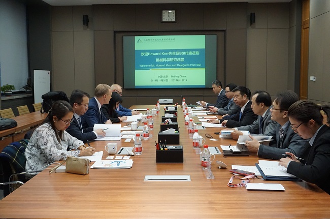 李建友副總經(jīng)理對霍華德•科爾先生一行的到來表示熱烈歡迎,并重點圍繞集團(tuán)在基礎(chǔ)共性技術(shù)研究、標(biāo)準(zhǔn)化、檢驗檢測、認(rèn)證認(rèn)可、行業(yè)服務(wù)等方面業(yè)務(wù),以及在支撐中國裝備制造業(yè)高質(zhì)量發(fā)展中發(fā)揮的重要作用進(jìn)行了系統(tǒng)介紹?;羧A德•科爾對機(jī)械總院集團(tuán)的熱情接待表示感謝。他表示,自今年9月李建友副總經(jīng)理率團(tuán)訪問BSI以來,機(jī)械總院集團(tuán)與BSI的合作被提到新的高度,希望雙方重點圍繞設(shè)施管理、增材制造等方面形成全方位的務(wù)實合作,實現(xiàn)在標(biāo)準(zhǔn)、檢測、認(rèn)證等方面的共贏發(fā)展。雙方還就2020年共同舉辦中英標(biāo)準(zhǔn)化高峰論壇等事宜進(jìn)行了深入探討。